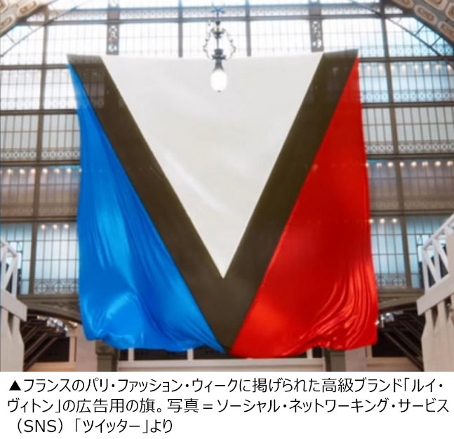 パリ・ファッション・ウィークにルイ・ヴィトンが出した広告を見ると、中央にVという文字が描かれた青・白・赤の大きな旗が登場する。これはフランス国旗の3色とルイ・ヴィトンのロゴである「V」という文字をデザインしたものだが、ロシア国旗の色とロシアによるウクライナ侵攻を支持するシンボルマーク「V」の文字とも一致する。