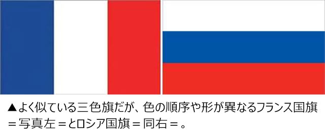 フランス国旗とロシア国旗には同じ3つの色が使用されている。フランス国旗は青・白・赤が縦に配置されているが、ルイ・ヴィトンの旗の色の配置はこれと一致する。一方、ロシア国旗は上から順に白・青・赤が横に配置されている。