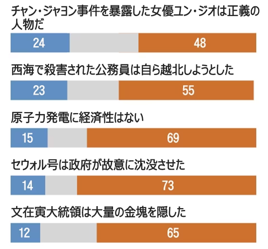 「原子力発電に経済性はない」(うそ69%・事実15%)、「文在寅元大統領が大量の金塊を隠した」(うそ65%・事実12%)、「西海で殺害された公務員は自ら越北しようとした」(うそ55%・事実23%)などでは「うそ」との回答割合が相対的に高かった。