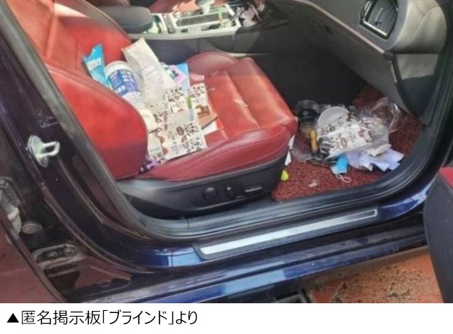 匿名掲示板「ブラインド」には「到底理解できない妻の車の衛生状態」と題する投稿があった。夫とみられる投稿者は「子供2人の登下校に使っている車だが、助手席がいつもごみ捨て場だ。8年間文句を言っているが、全く改善の兆しがない。きょうもののしりながらセルフ洗車場に行く」と書いている。