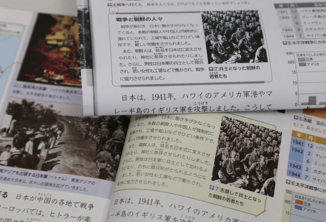 新しい教科書には日帝強占期に強制的に徴兵・連行された韓国人に対する記述が以前よりも弱まるか、あるいは曖昧な表現に薄まった。55%と最も高いシェアを持つ東京書籍発行の6年生社会科教科書は徴用について「多くの朝鮮人と中国人が強制的に連れてこられて」だったのが、「強制的に動員された」に変更された。今回も「強制的に」という表現は削除せずそのまま使用された。しかし連行するという意味の「連れてこられた」は「動員された」と純化された表現に変わった。同じ教科書で徴兵に関する表現は「日本軍の兵士として徴兵され」という文章が「日本軍に兵士として加わるようになり、のちに徴兵制が取られるようになりました」に変わった。教育出版の教科書も「日本軍の兵士として徴兵され、戦場に送られた」だった以前の記述から「徴兵され」が除外された「日本軍の兵士として戦場に送られた」に修正された。