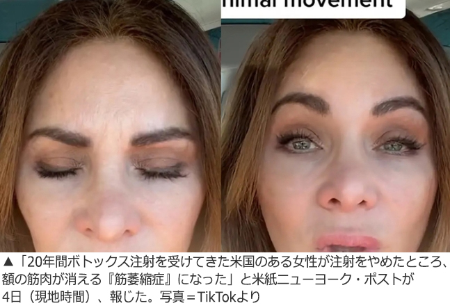 【NEWSIS】シワや老化防止のため、過去20年間にわたりボトックス注射を受けてきたある女性が、注射を中止した後の自身の肌をありのままに公開した。そして、「額の筋肉がなくなる『筋萎縮症』を患っている」と明かした。