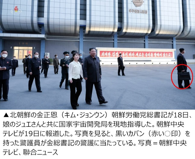 これまで「手ぶら」警護だった北朝鮮の警護員たちが黒いカバンを持っている姿が初めてカメラにとらえられたのは、16日に行われた平壌市和盛区域の住宅完工式だった。この日は岸田首相が選挙演説会場で爆発物テロに遭った翌日だ。このため、日本のテロ事件を見て、北朝鮮が金正恩氏の警護原則をすぐに変えたという見方が出ている。19日に党機関紙の労働新聞が報じた金正恩氏の国家宇宙開発局現地視察写真でも、警護員たちは黒い防弾カバンを持っていた。この2カ月前の今年2月、金正恩氏が平壌郊外の大規模野菜温室農場「江東温室農場」建設着工式に出席した時は、警護員たちは何も持っていなかった。専門家らは、カバンの中には銃器類が入っており、有事の際には盾の役割もするとみている。