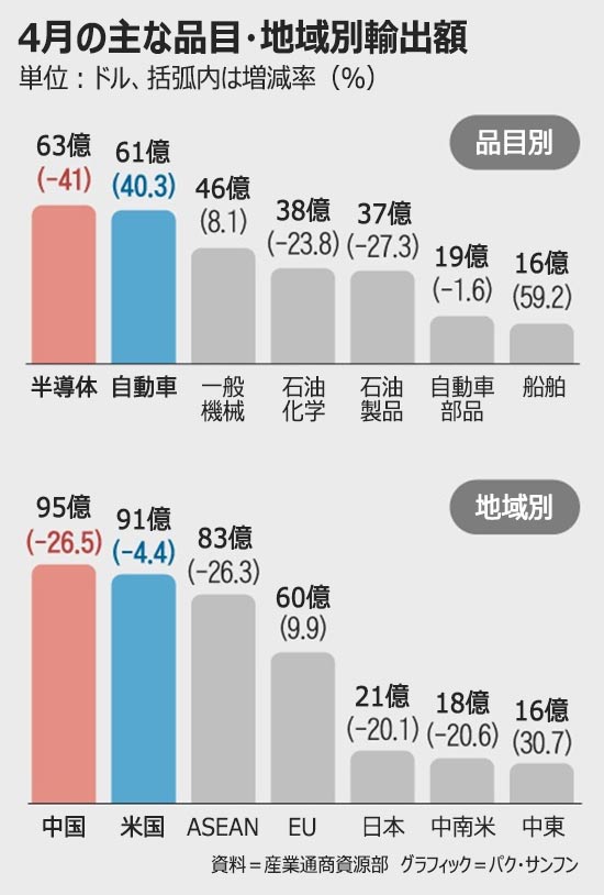 輸出見通しは依然として不透明だ。4月は半導体、ディスプレーなどIT製品をはじめ、石油製品、石油化学、鉄鋼など15大輸出品目のうち自動車、船舶、一般機械を除く12品目で輸出が軒並み減少した。地域別でも欧州連合(EU)、中東向け輸出がそれぞれ9.9%、30.7%増加したが、中国、東南アジア諸国連合(ASEAN)向けは20%台の減少だった。