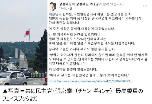 日本の岸田文雄首相がソウル市銅雀区の国立墓地「国立ソウル顕忠院」を訪れた際、日本国旗の日の丸が掲揚されたことに関連して、韓国の最大野党・共に民主党の張京泰(チャン・ギョンテ)最高委員が「まさに痛嘆すべきことだ」と主張した。
