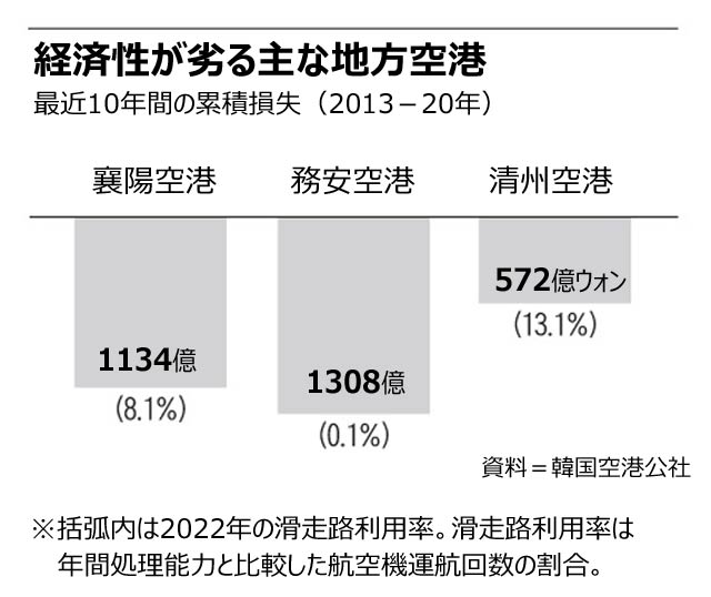 金大中(キム・デジュン)政権の実力者が推進した全羅南道の務安空港も事情は同じだ。国庫から3000億ウォンを投入し、07年開港したが、慢性的な赤字だ。昨年務安空港の当期純損失は200億ウォン、最近10年間の損失額は1300億ウォンを超えた。274万平方メートルの敷地に整備された2800メートル滑走路の利用率は国内最低の0.1%にすぎない。がら空きの滑走路にトウガラシを干す写真が公開され、「トウガラシ空港」とも呼ばれる。