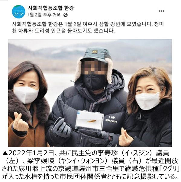 この団体が釣った魚の中には絶滅危惧種である「クグリ」(和名・ズナガドジョウカマツカ)も含まれていた。研究目的であっても、保護種の捕獲には、政府の許可手続きが必要だ。ところが、この団体はクグリを不法捕獲したばかりか、水槽に入れて記念写真までした。そして、「4大河川の堰開放でクグリが帰ってきた」と主張した。だが、この主張について、専門家は「漢江流域に元々住んでいたクグリが堰の開放で水位が下がると移動してきたものだ」と話した。堰の開放で水がきれいになってクグリが帰ってきたのではなく、以前から漢江にいたとの指摘だ。