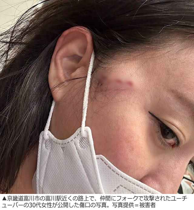 この女は同日午前0時10分ごろ、富川市内の富川駅近くの路上で、ユーチューバー仲間の30代の女性に向かってフォークを振り回し、顔にけ..