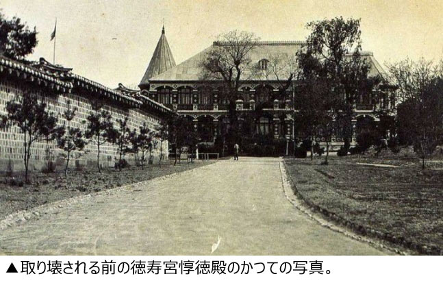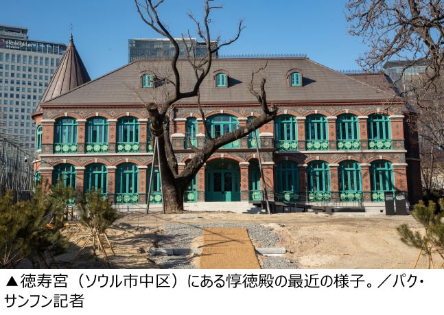 消えた惇徳殿を再建したのは、2018年に本格化した「徳寿宮の元の姿取り戻し」によるものだ。発掘調査を終えた後、惇徳殿の復元が始まり、最近外部の工事を終えた。今年5月に扁額(へんがく)を掛ける「懸板式」を行い、9月の開館を予定している。ところが文化財庁は「復元」ではなく「再建」だと言葉を変えた。「資料不足のせいで原形通りに建てることができず、写真などを参考にして新たに作った」。つまり、建物の多くの部分を想像力で補ったということだ。
