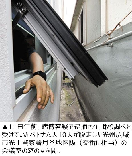 光州広域市で、賭博容疑により逮捕されたベトナム人10人が警察地区隊(交番に相当)のわずか17センチメートルの窓のすき間から集団脱走した。不法滞在者であるこれらの容疑者たちは強制送還されるのを恐れて脱走したものとみられる。光州警察庁が11日に明らかにした。