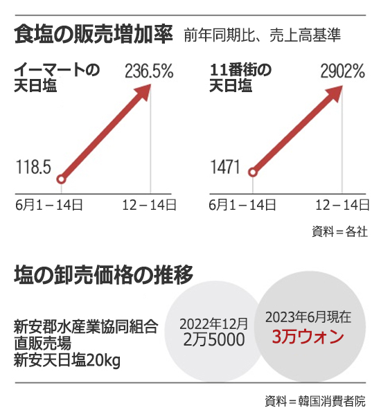 だが一部には、「福島原発汚染水放出『怪談』に需給の不均衡が加わって塩の価格が急騰している」という見方もある。ある食品会社の関係者は「今年は雨があまりにもたくさん降ったため、全羅南道新安郡で生産される天日塩の量がこの10年間の平均の70%ほどと大幅に減っており、塩の価格が高騰したのが1次的な原因だ。これに加え、ここ数年は風力発電をするということで塩田の面積が減り続けているため、生産量が減少しているのも一因」と語った。