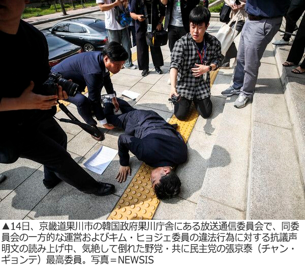 張京泰最高委員は14日、韓国政府が推進する「KBS受信料分離徴収」措置に抗議をするために放送通信委員会を訪れ、声明が読み上げられている最中に突然倒れた。これについて、インターネット・コミュニティー・サイトを中心に「気絶ショー」という声が上がっている。張京泰最高委員があぐらをかいて座っている様子や、その時のひざの部分のふくらみから、「あらかじめひざにプロテクターを付けていたように見える」というものだ。