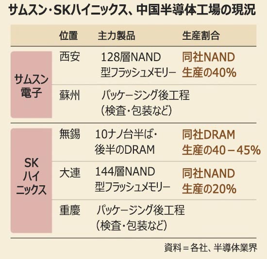 【表】サムスン・SKハイニックス、中国半導体工場の現況