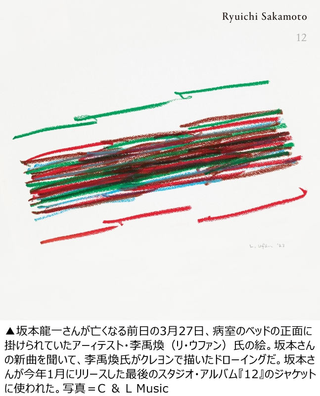 日本のメディアが報道した自伝の内容によると、坂本さんが死去する前日の3月27日、病室のベッドの正面には韓国人アーティスト・李禹煥氏の絵が掛けてあったという。71歳の誕生日だった1月17日にリリースしたスタジオ・アルバム『12』のジャケットに使用した絵だ。李禹煥氏とかねてから親交のあった坂本さんがアルバムジャケットに使用するために自ら頼んだそうだ。李禹煥氏は坂本さんの新曲を聞いて抱いた感情を抽象的なドローイングで表現した。「風の音、宇宙的な音の束が降りてくる感じを受け、いろいろな色の線を重ねて描いた」という。