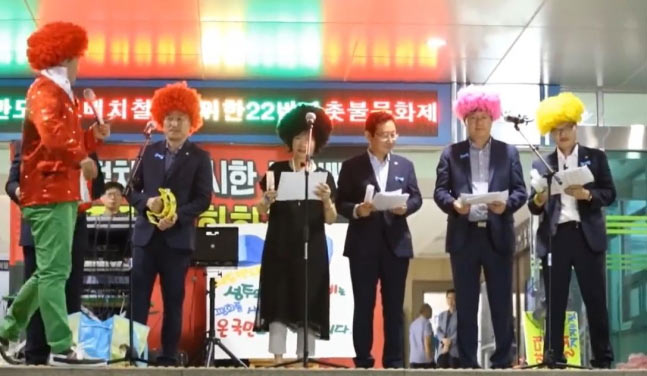 ▲2016年当時、民主党議員が慶尚北道星州郡でかつら姿で踊りながら大衆歌謡を替え歌にした「THAADデマソング」を歌っている。/フェイスブック「星州THAAD配備撤回闘争記録室」より