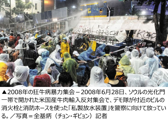 【写真】2008年の狂牛病暴力集会…警察に向けて放水するデモ隊