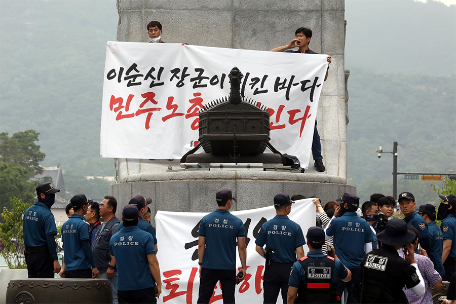 民主労総のメンバー約20人はこの日午前10時ごろ、光化門広場にある李舜臣(イ・スンシン)の銅像の前で、汚染水放出の中断と尹錫悦(ユン・ソンニョル)政権の退陣を求めるデモを行った。さらに、デモに参加したメンバーのうち2人が李舜臣の銅像に上り「李舜臣将軍が守った海、民主労総が守る」と書かれたプラカードを掲げてシュプレヒコールを上げた。
