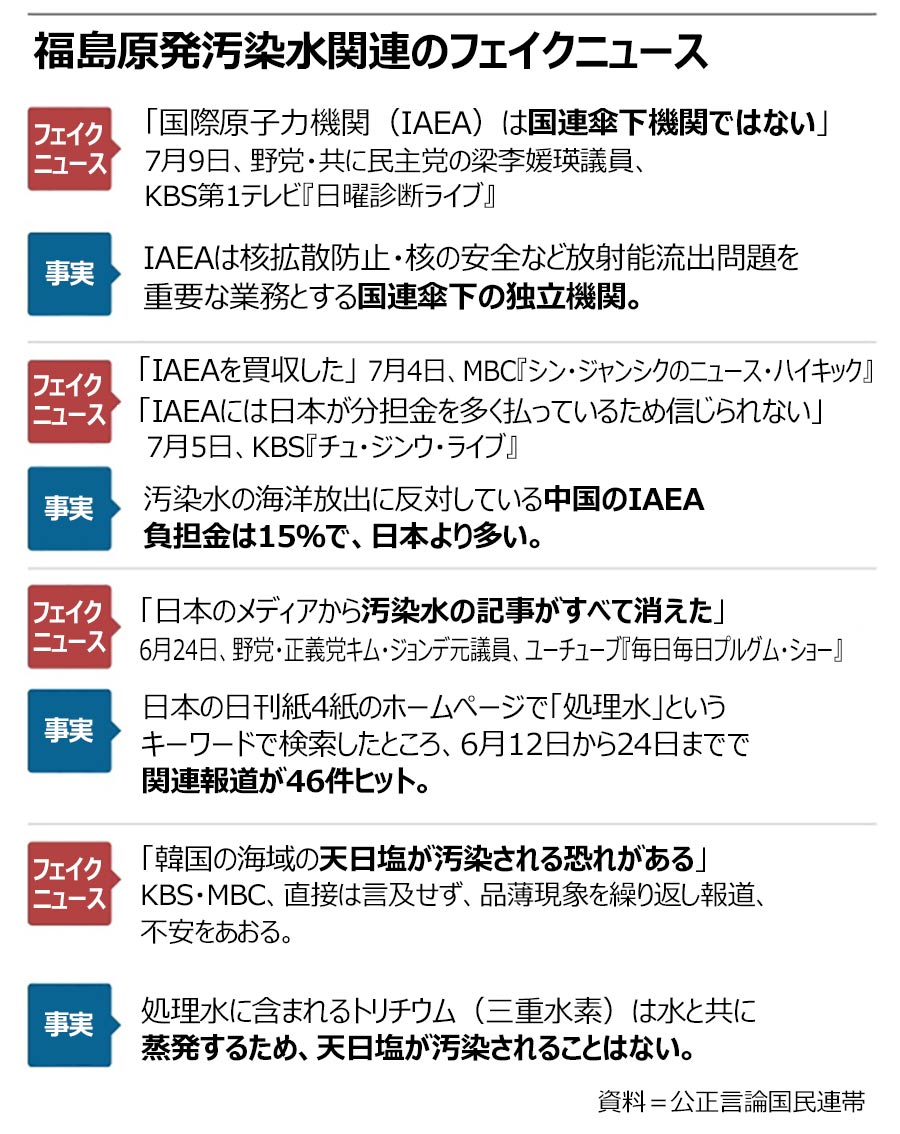 福島関連フェイクニュース19件には大きく分けて▲「尹錫悦(ユン・ソンニョル)政権非難」 ▲「国際原子力機関(IAEA)中傷と反日感情刺激」 ▲「食品に対する不安と核に対する恐怖の助長」の3種類が存在することが分かった。福島原発処理水の安全性を検証したIAEA包括報告書の発表後は、IAEAの信頼性を傷つけるために作られたフェイクニュースが数多く登場した。野党・共に民主党の梁李媛瑛(ヤンイ・ウォンヨン)議員は9日、KBS第1テレビの時事番組『日曜診断ライブ』に出演し、「IAEAは国連傘下機関ではない」と主張したが、これは全く事実ではなかった。また、「IAEAには日本が分担金を多く払っているため信じられない」(7月5日放送のKBS『チュ・ジンウ・ライブ』など)とも主張したが、これも誤った事実認識に基づいていた。公正言論国民連帯は「実際は海洋放出に反対している中国の分担金は15%で、日本より多い」と指摘した。