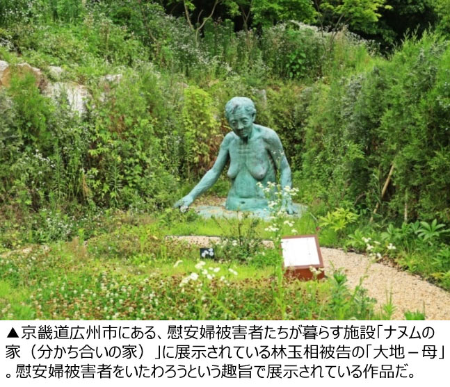 京畿道広州市にある、慰安婦被害者たちが暮らす施設「ナヌムの家(分かち合いの家)」にも林玉相被告が慰安婦被害者たちのために製作した作品が展示されている。下半身が地面に埋まり、地面の上に両手と上半身を出し、垂れ下がった胸をあらわにした高齢女性が考え込んでいる様子の「大地-母」という連作だ。