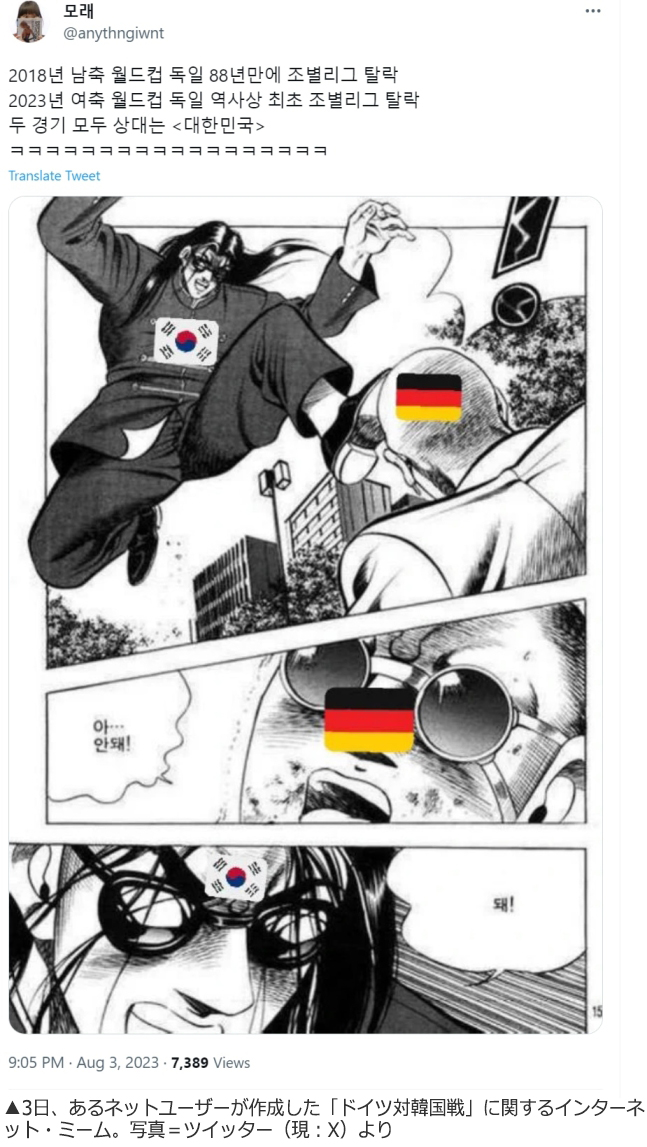 国内外のネットユーザーたちが作った「インターネット・ミーム」(meme=ネットで拡散される画像など)も多数出現した。涙を流しながら笑う絵文字と共に「韓国がやったぞ! ドイツはまた家に帰る」と書かれた文や、格闘漫画のキャラクターに韓国国旗とドイツ国旗を描き入れた合成画像などが話題を集めた。「これ、前に見た(2018年W杯の)シーンみたいだけど?」「W杯で変わらないこと 韓国はドイツの滅亡を手伝うということ」などのコメントも相次いだ。
