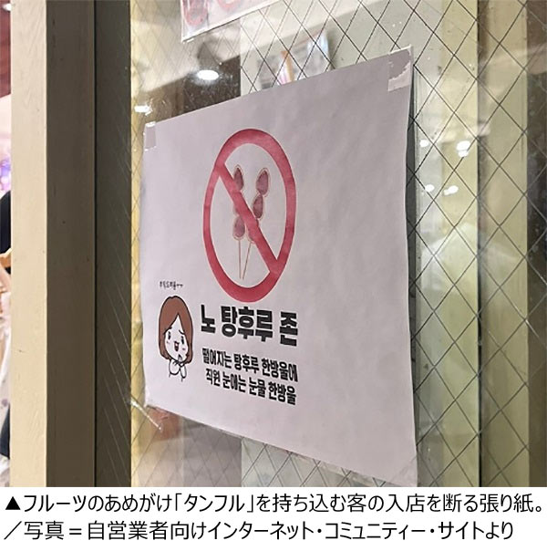 このためタンフルを持って店に入ってくる客を断る「NOタンフル・ゾーン」の店も出てきた。タンフルの店が多い仁川チャイナタウンのあるカフェ関係者は本紙の取材に「タンフルが流行して以降、タンフルを持った客を入店禁止にする店が増えた」「当店では入店禁止まではしていないが、タンフルを持って入ってくる客にはあらかじめウェットティッシュを渡すなどの措置を取っている」と話す。同じ地域にある別のカフェの関係者は「入店禁止まではしなくても、タンフルのゴミなどの問題があるため、当店ではお客様がタンフルを持って来られたら別に保管しておき、店を出る時にまたお返しする方式を取っている」と語った。