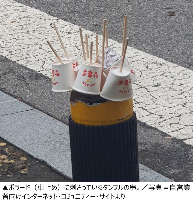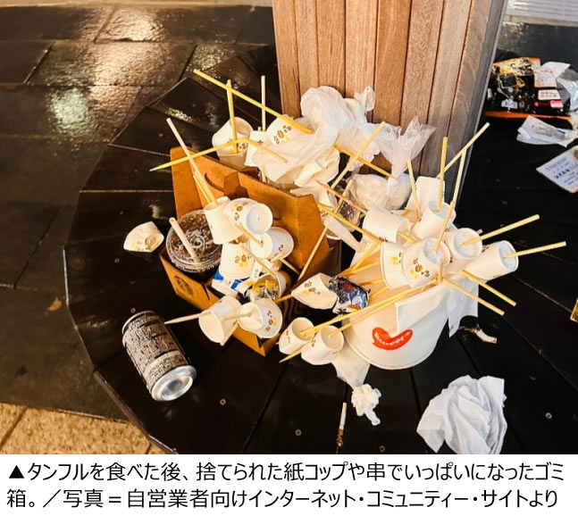 しかし、タンフルを売っている店の周辺は「タンフルのゴミ」のせいで頭を抱えている。SNSなどには最近、食べ終わったタンフルの串や紙コップが雑然と捨てられている様子を撮った写真が多数アップされている。これらの写真を見ると、ベンチやゴミ袋だけでなく、歩道に車が進入するのを防ぐために設置されたボラード(車止め)にタンフルのゴミが刺さっているものまである。