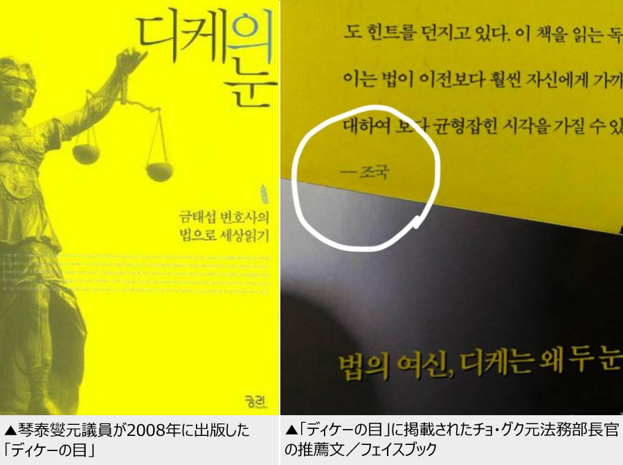 ところが琴元議員は15年前の2008年に「ディケーの目」という題名の本を出している。クァク広報はその点に触れ、「タイトルが似ている本もあり得る。ところが琴元議員が書いた『ディケーの目』に推薦文を書いた人物がまさにチョ・グクだ。これはどう解釈すべきか」と述べた。チョ元長官はソウル大学法学部教授として在職当時、琴元議員の指導教授だった。