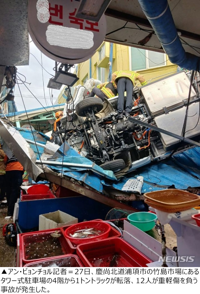 【NEWSIS】慶尚北道浦項市の竹島市場にあるタワー式駐車場から1トントラックが転落する事故が発生した。浦項北部消防署が27日に明らかにしたところによると、同日午後4時15分ごろ、浦項市北区の竹島市場にあるタワー式駐車場4階から1トントラックが1階に転落したという。