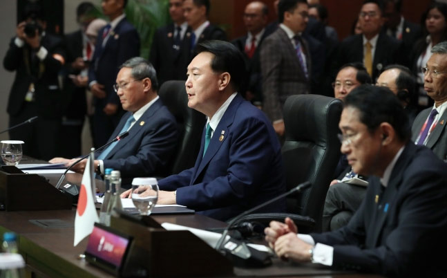 ▲6日(現地時間)、インドネシアのジャカルタ・コンベンションセンター(JCC)で行われた「ASEAN+3(韓日中)」首脳会議で発言する尹錫悦(ユン・ソンニョル)大統領。写真=聯合ニュース