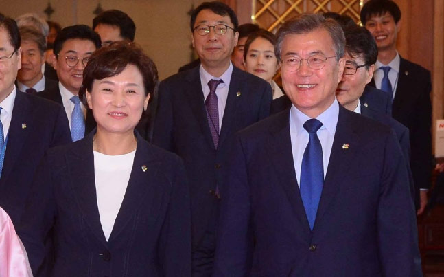 ▲2017年6月21日、当時の文在寅大統領が青瓦台で金賢美(キム・ヒョンミ)国土交通部長官に任命状を授与後、懇談会の会場向かっている/聯合ニュース