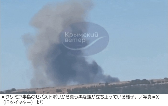 メッセージアプリ「テレグラム」の現地チャンネルやソーシャルメディア(会員制交流サイト)にアップロードされた動画には、クリミア半島のセバストポリに近いベルベク飛行場とされる場所から大きな煙が立ち上る様子が収められている。