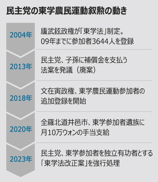 野党側はこれまで、「反乱軍の子孫」を「革命軍の子孫」として名誉回復する趣旨だとして、盧武鉉(ノ・ムヒョン)政権時代から東学農民運動関連の法律を作ってきた。盧武鉉政権は2004年に東学法を制定し、東学農民運動参加者・遺族の登録申請を受け付けた。申請は低調で、06年には法律を改正して遺族の範囲を「高孫子女(やしゃご)」にまで拡大した。独立有功者の場合、遺族は「孫」までなのに、破格の範囲拡大を行ったのだ。民主党は13年には、東学農民運動参加者子孫に独立有功者と同水準の補償金を支払う法案も発議した。文在寅(ムン・ジェイン)政権時代では、09年に終了した東学革命参加者および子孫の登録事業を9年ぶりに再開した。全羅北道井邑市は2020年から、東学農民運動参加者遺族に毎月10万ウォン(現在のレートで約1万1000円)ずつ手当を支払っている。