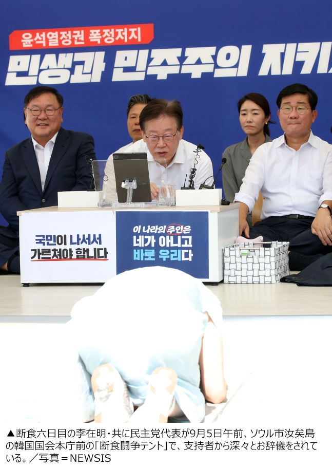 進歩(革新)系最大野党「共に民主党」の代表で、糖尿の持病があるといわれる李在明(イ・ジェミョン)氏が、8月31日に断食を始めたとき、心配するよりも「応援」する人の方が多かった。政治家が次々と現場を訪れて「記念ショット」を撮り、ある女性支持者は壇上に座る李在明代表を拝もうとして阻止された。実際に腰をかがめて拝んだ支持者も複数いる。母親らは子どもを連れてきた。金泳三(キム・ヨンサム)の名言の通り、「人は食べなければ死ぬ」。李代表が「死を覚悟した断食」を始めたと信じたのであれば、そういう現場に子どもを連れてきて写真を撮る母親はいなかっただろう。断食を始めて半月経ってからは雰囲気が変わった。「譲位」を宣言した王に泣いて訴えるかのように、引退した大物たちまで出てきて「考え直してください」という雰囲気を演出した。
