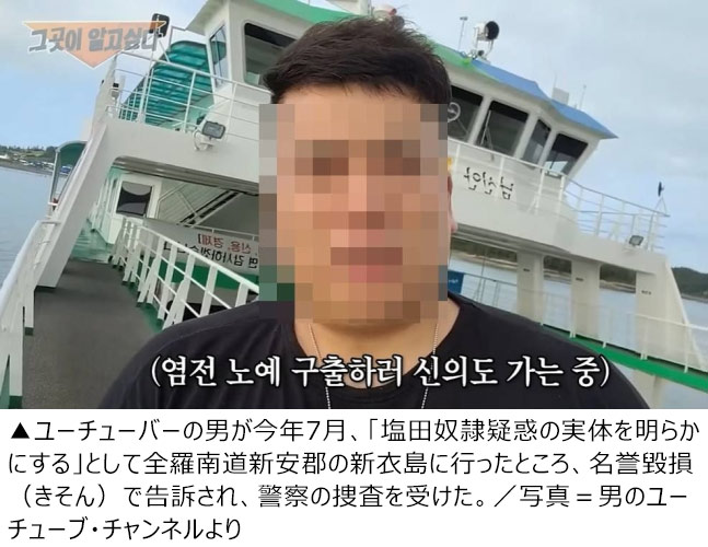 「『塩田奴隷』疑惑の実態を明らかにする」として、全羅南道新安郡の島へ行き、動画を撮影したユーチューバーの男が地元住民から告訴され、警察の捜査を受けている。