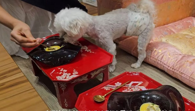 ▲ソウル市江南区清潭洞にオープンした「愛犬おまかせ店」。シェフが犬のために心を込めて作った前菜料理をスプーンで食べさせている。その後、牛肉とカンガルー肉を焼き、別のシェフがそのにおいが広がるようにあおいだ。写真=動画共有サイト「ユーチューブ」より