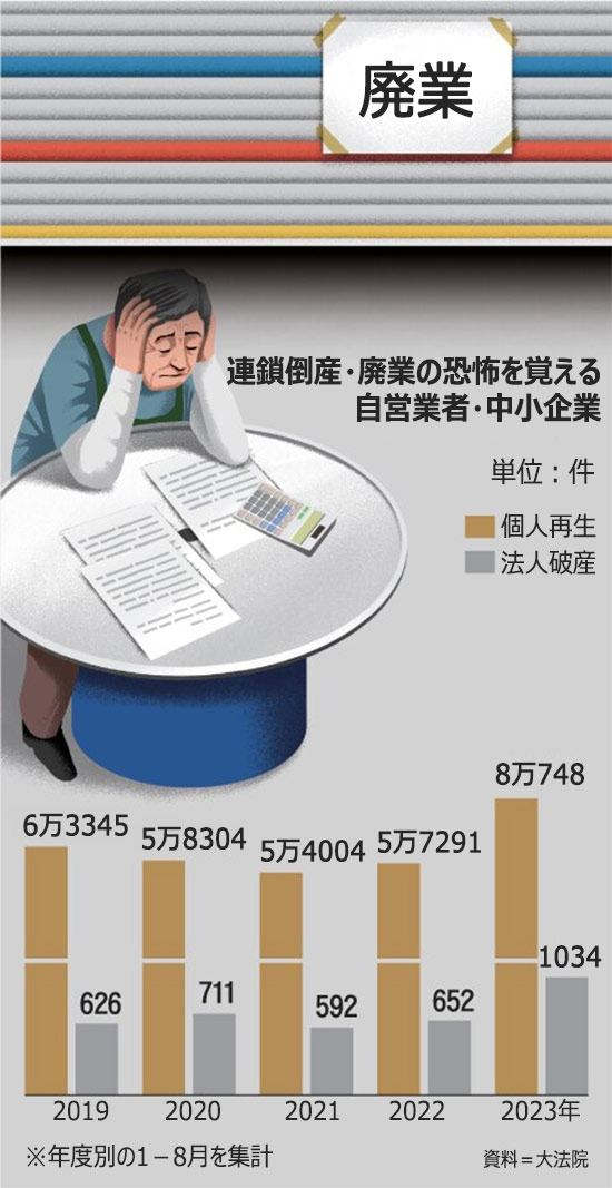 こうした統計数値は「リーマンショック」などで世界的な金融危機が起きた2009年を上回る数値だ。法人破産は09年に通年で226件だった。コロナが終わり、エンデミック(日常的に流行する感染症)への移行が宣言された今年は8月までの時点で09年通年の4倍に達している。個人再生も09年通年で5万4605件だったが、今年は8月までに8万件を超えている。