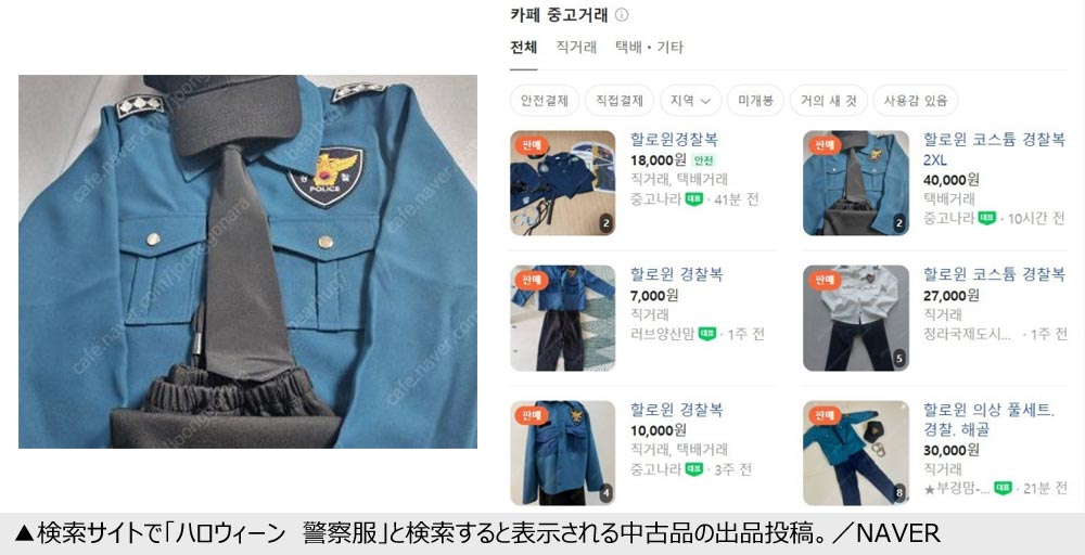 24日現在、検索サイトで「ハロウィーン 警察服」「制服 コスプレ」などのワードで検索すると、警察の制服を販売するという投稿が多数見つかる。ほとんどは1万-3万ウォン(約1100-3300円)程度と比較的手頃な価格設定だ。警察の制服だけでなく、実際に警察が使うものにそっくりな警棒、無線機、手錠などがセットで5万-6万ウォン(5500-6600円)程度で売られているケースもあった。