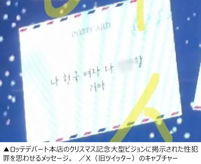 ロッテデパート本店(ソウル市中区)に設置されたクリスマスイベント用の大型ビジョンに、性犯罪を予告するようなメッセージが掲載され、物議を醸している。