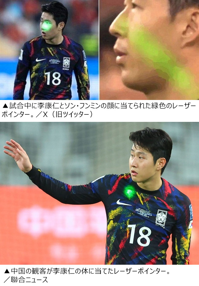 今月21日に中国・深センで行われた2026年サッカー・ワールドカップ(W杯)アジア2次予選の韓国-中国戦で、中国の観客による数々のマナー違反が物議を醸している。韓国代表の孫興民(ソン・フンミン)と李康仁(イ・ガンイン)の顔や体に緑色のレーザーポインターを向けたり、試合開始前の愛国歌(韓国の国歌)演奏でブーイングしたりしたのだ。