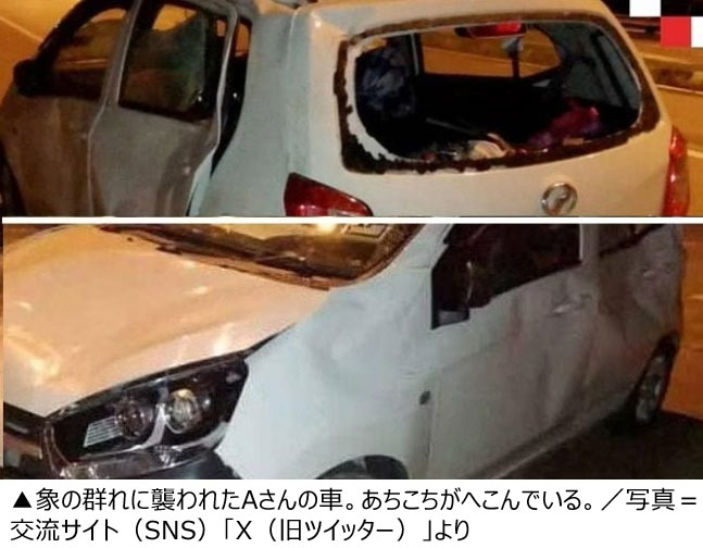 Aさんはカーブしている道に沿ってハンドルを操作した瞬間、鈍い音とともに強い衝撃を感じた。道路上にいた子象に気付かず、ぶつかったのだ。さらに危険なことに、子象が路上で倒れ込むや、近くでこれを見ていた別の象5頭が一斉にAさんの車に向かって走り始めたのだ。