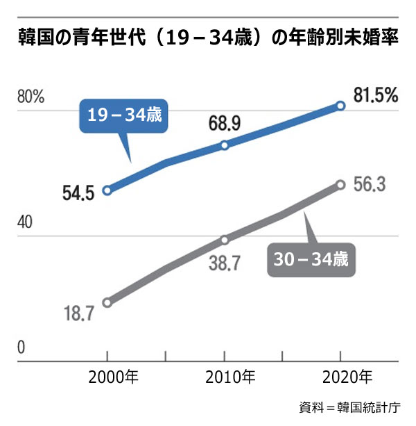 青年世代の未婚率は近年、上昇傾向にある。19-34歳の未婚率は2000年には54.5%だったが、2010年には68.9%に上昇し、2020年には81.5%まで跳ね上がった。統計庁の調査で、青年の未婚率が80%を超えたのは今回が初めてだ。 平均婚姻年齢(2020年基準。男性33.2歳、女性30.8歳)に該当する30-34歳の未婚率も5割を超えた。2000年には30代前半で結婚していない人は18.7%だったが、2020年には56.3%となり、20年間で37.6ポイントも上昇した。30代後半(35-39歳)と40代前半(40-44歳)で結婚していない人は、20年前の2000年にはそれぞれ7.5%、3.8%でかなり少なかったが、2020年にはそれぞれ30.7%と21.0%まで上昇した。