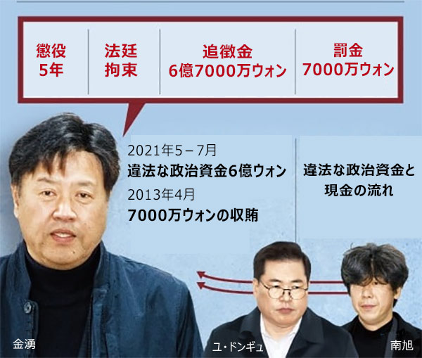 またユ元本部長を通じて金被告に資金を提供した弁護士の南旭(ナム・ウク)被告に対しては懲役8年が宣告された。一方でユ元本部長と城南都市開発公社のチョン・ミンヨン元戦略事業室長は「単なる橋渡し役」との理由で無罪が宣告されている。