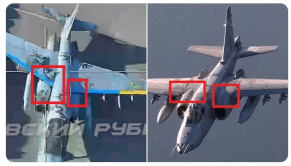 ▲破壊されたSu25とみられる戦闘機(写真左)と実際のSu25/X(旧ツイッター)