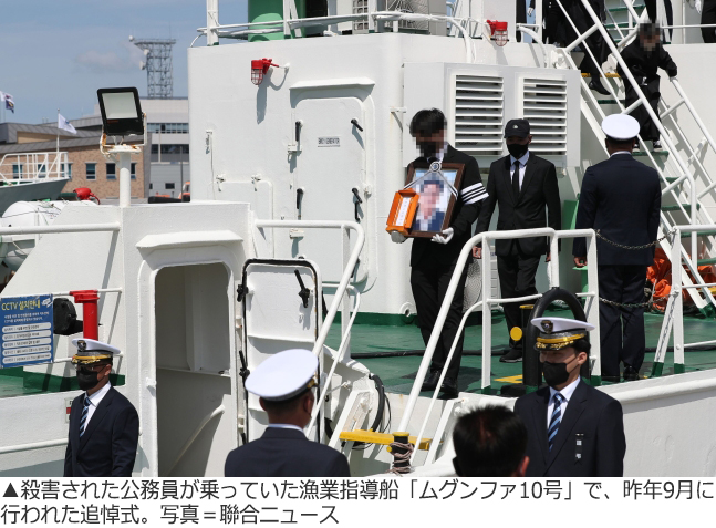 【写真】殺害された公務員が乗っていた漁業指導船「ムグンファ10号」で昨年9月に行われた追悼式