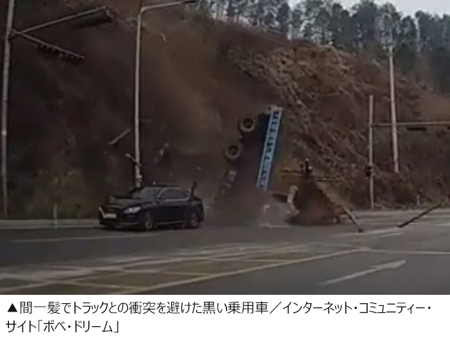 ドライブレコーダー映像で注目を集めているのは間一髪でトラックと正面衝突せずにすんだ黒い乗用車だった。この乗用車が通過してから1秒もしない間にトラックが転落したのだ。乗用車は木材などの破片が当たる程度の被害で済んだという。男性は「おそらく少しでも遅れていれば黒い乗用車とドライバーも下敷きになっていただろう。これを天運というのではないか」とコメントした。