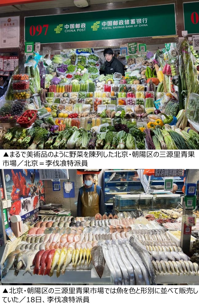 12月18日午前、北京・朝陽区の三源里青果市場を訪れると、まるで画廊に入ったかのような錯覚を覚えた。1500平方メートルの室内空間の両側に2メートル四方の店舗が並ぶ。店ごとに明るい照明の下、生鮮食品がきれいに陳列されていた。野菜売り場にはビニール容器で包装した野菜が整然と積まれており、その周囲を束野菜で囲み、まるで絵に額縁に入れたような演出をしていた。鮮魚売り場にも赤い魚、背が青い魚などを繊細に..