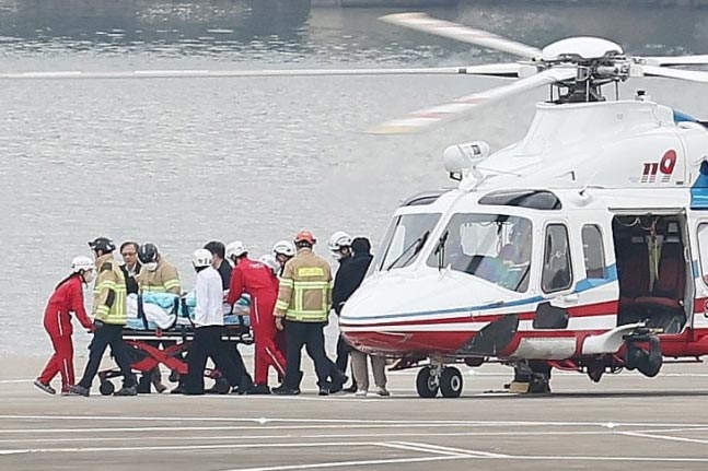 ▲釜山で身元不詳の男に襲われた李在明・共に民主党代表が2日午後、ヘリコプターでソウル市銅雀区のノドゥルソムに到着し、ソウル大学病院へ移送されている様子。/ニュース1