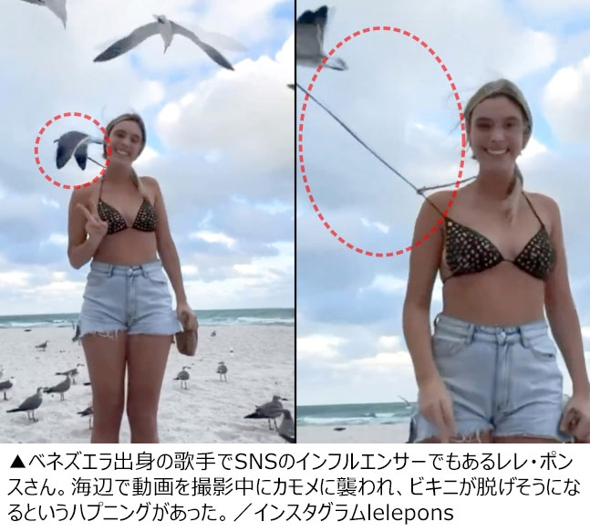 ベネズエラ出身の歌手で、SNS(交流サイト)で数万人のフォロワーを抱えるインフルエンサーでもあるレレ・ポンスさん(27)が、海辺でカモメをバックに記念動画を撮影している最中に突然カモメにビキニの紐を引っ張られるという仰天ハプニングが起きた。