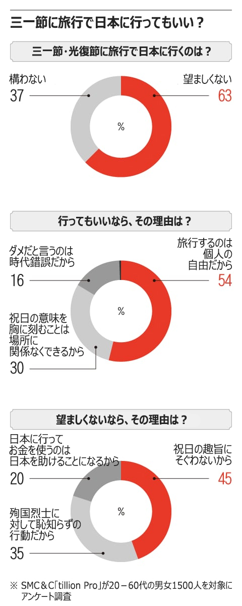 「三一節に旅行で日本に行くのは望ましくない」と考える人にその理由を尋ねると、「他の所に行けるのに、あえて日本に行くのは祝日の趣旨にそぐわないから」という回答が45%で最も多かった。次いで「殉国烈士のことを考えれば恥知らずの行動だから」(35%)、「日本を観光してお金を使うことは日本を助けることになるので望ましくない」(20%)などだった。