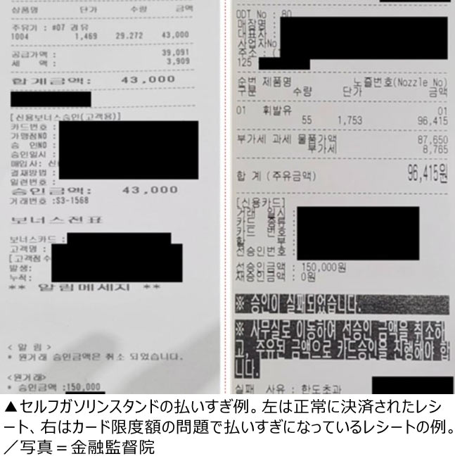 金融監督院は「セルフガソリンスタンドでカード決済する時はレシートを必ず見て、決済金額が実際に給油した金額と一致するか確認しなければならない。特にレシートに『承認失敗』『限度額超過』『再承認失敗』などと書かれていた場合はガソリンスタンドに問い合わせなければならない」と注意を呼びかけた。